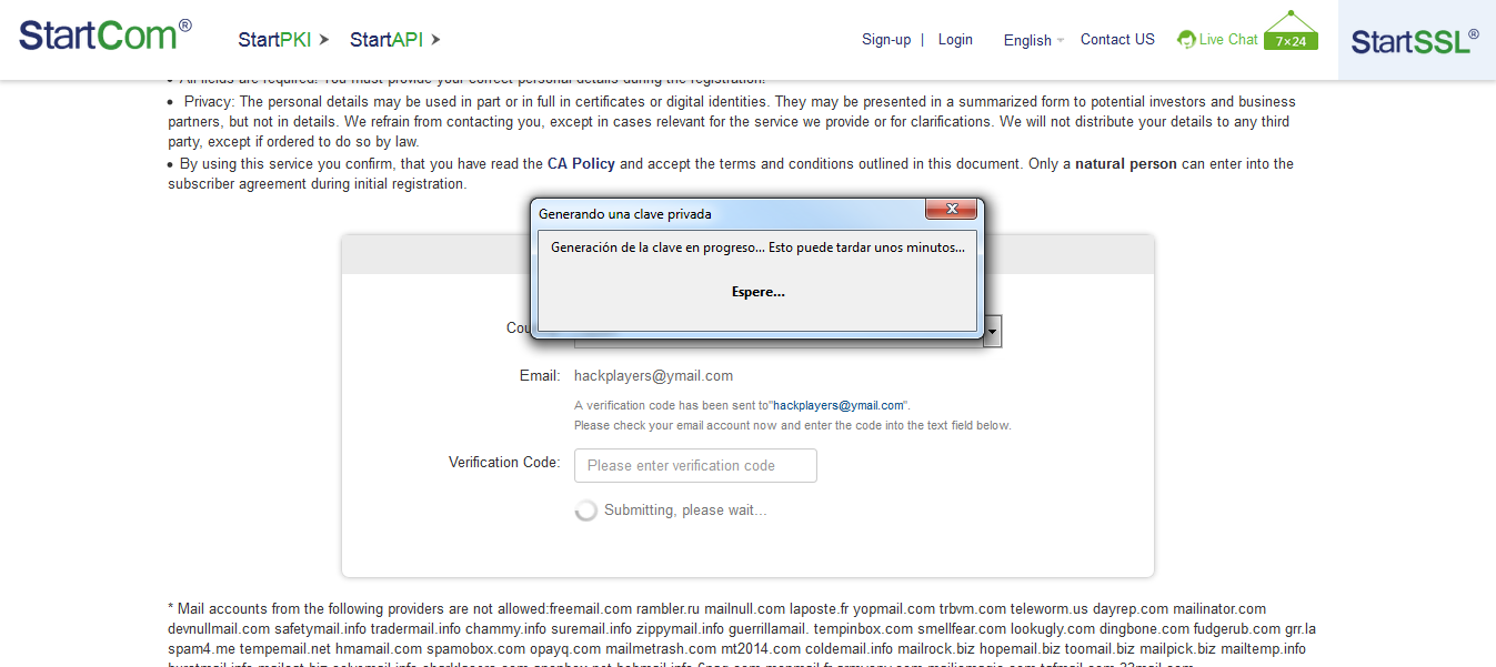 Después introducimos el país y nuestra dirección de correo. Llama la atención que hay algunos dominios baneados, aunque he podido generar un certificado para una cuenta de Anonbox.net sin problemas...